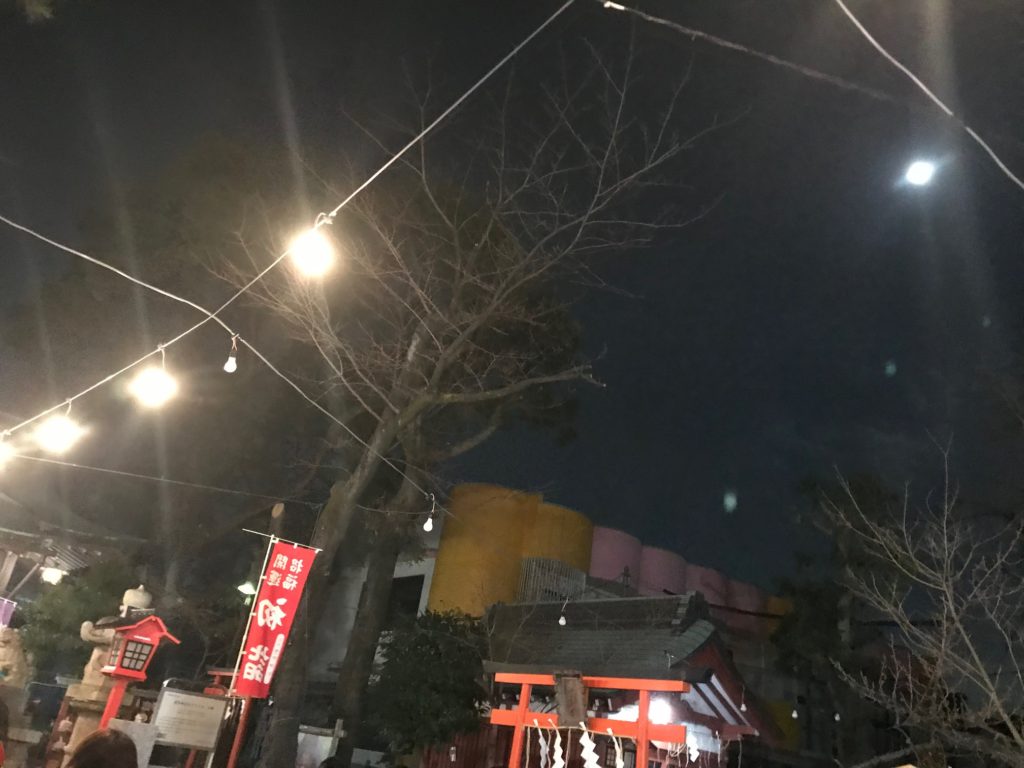 歩いて10分ちょっとのところにある熊野神社への道のりは土地勘がないため地味に遠く感じましたが無事に到着。夜の神社に参拝客を迎え入れるため参道はライトアップされており、境内は冷たい夜気に厳かな雰囲気が漂っておりました。