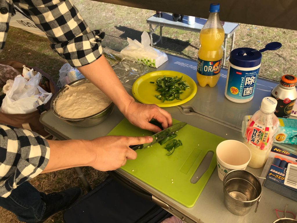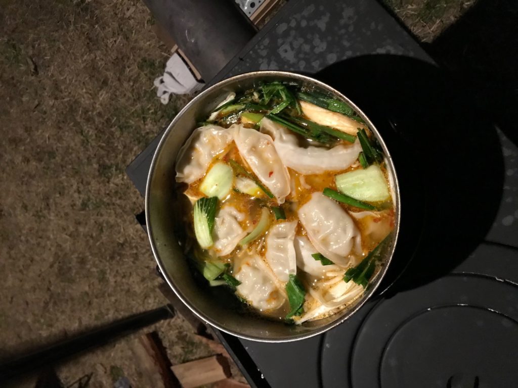 晩御飯は暖炉の天板に置いた鍋で「餃子坦々鍋」を作りました。ジュンさんと私と友達による完全なオトコ料理でしたが美味しくできました。ちなみに「ゆるキャン」の第三話でも紹介された料理ですが家でも十分に楽しめる料理です。