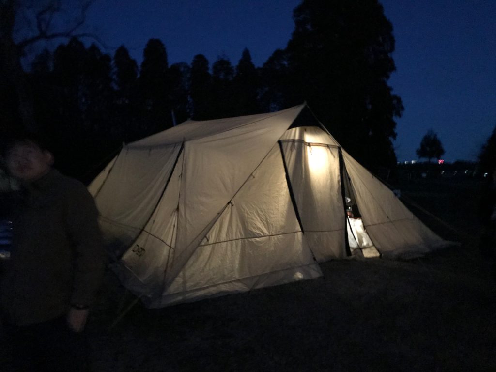 テントの設営までに風が強かったので凧のように吹かれ通しで不安でしたが、ペグ打ち(テントを張るための杭)でしっかりと固定したところで風も止まり一安心。外気と遮断されただけでテント内はほんのりと暖くほっと一息つきました。しかし日が落ちると寒くなるので、次は屋外暖炉の設置に取り掛かります。